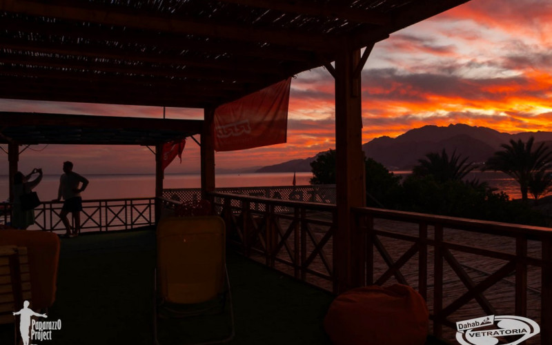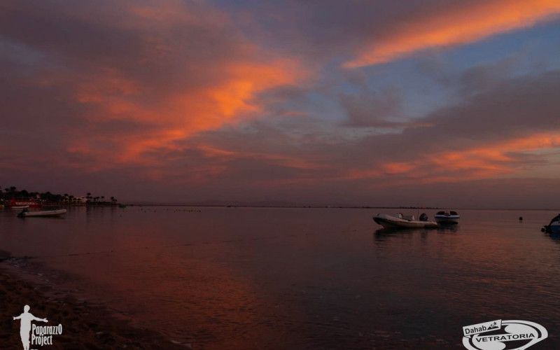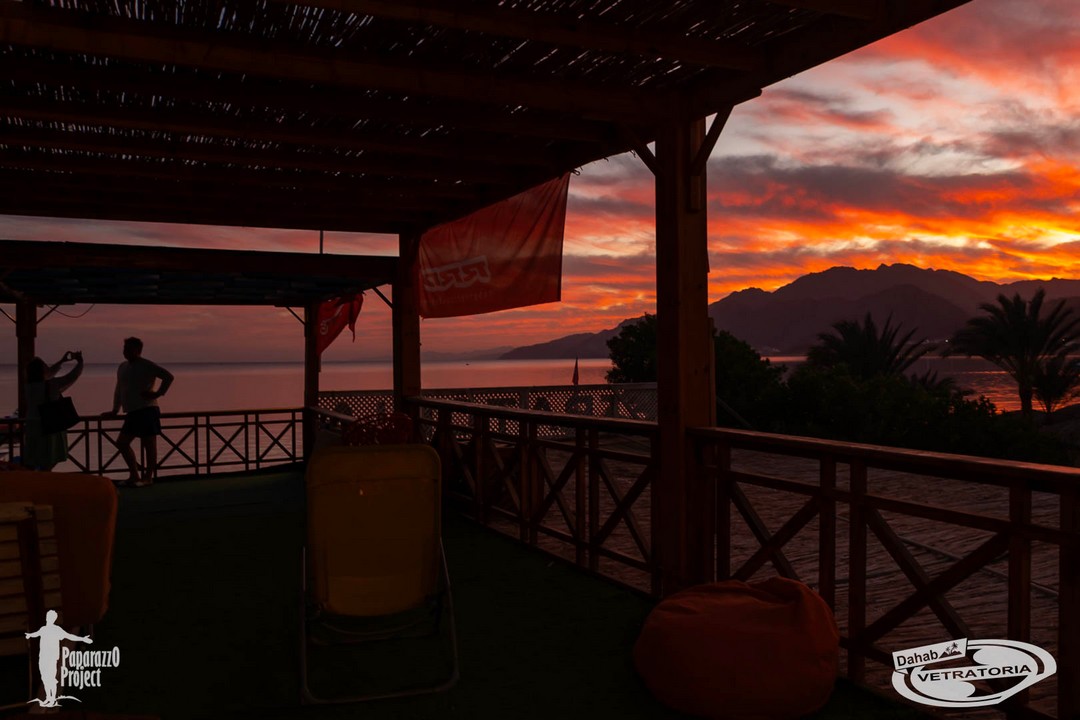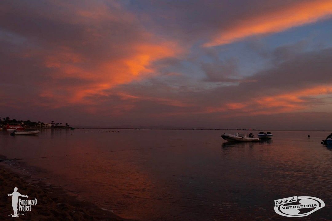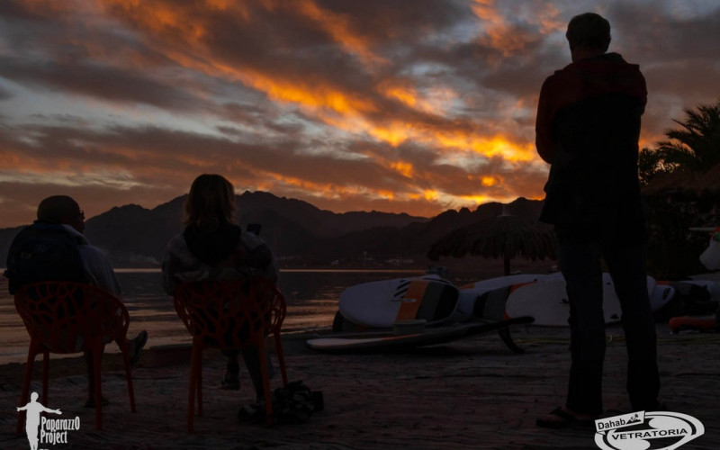 А ветер после новогодней ночи любит поспать до середины дня, как впрочем и мы тоже. Так что всем хорошо, никто никуда не торопится. Далее утреннее расписание сильно зависит от температуры воздуха. Если утром прохладно (ну, это в районе +20° C), то дует со стороны гор (северо-запад) и позже лениво разворачивает на северо-восток. Прекрасный повод для продвинутых поспать, позавтракать без суеты и выйти на воду в максимальный расколбас. А новичкам успеть до этого расколбаса потренироваться. Если гораздо теплее, то северо-запад не работает, все ждут у моря погоды натурально. Но дахабское счастье есть! Основательно прогретый воздух начинает своё привычное движение, и каталка продолжается до самого заката. Зато закаты в Дахабе зимой просто сногсшибательные! Созерцание их - отдельная культурная программа под завершение дня. Когда солнце уже скрылось за горами, и где-то там прижимается к самому горизонту, стеля свои лучи вдоль земли, облака на небе вспыхивают нереальными огненными красками. Кто знает об этом, заранее занимают первые ряды возле кромки моря, и получают совершенно фантастическое удовольствие и массу впечатлений от совершенно уникальной природной живописи.